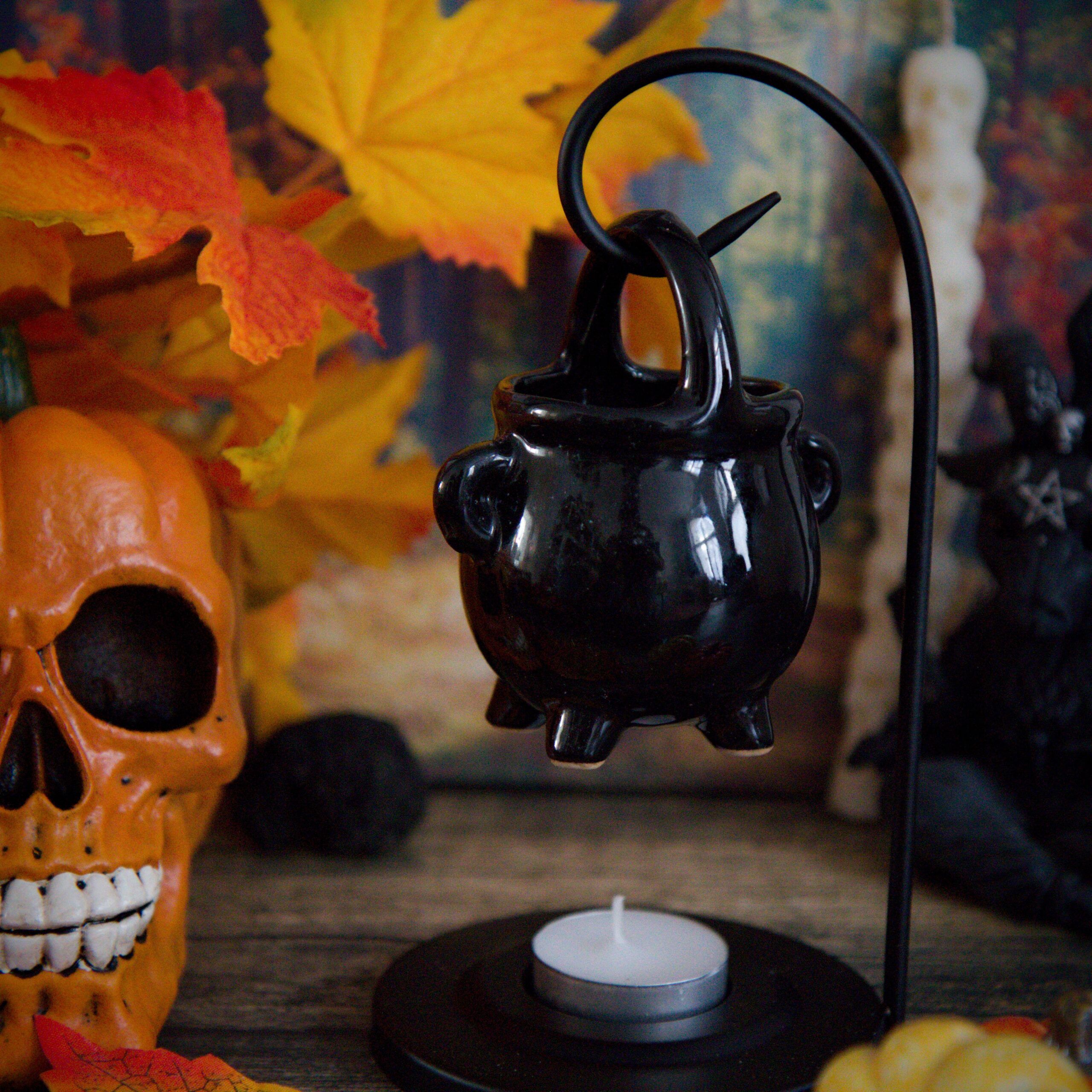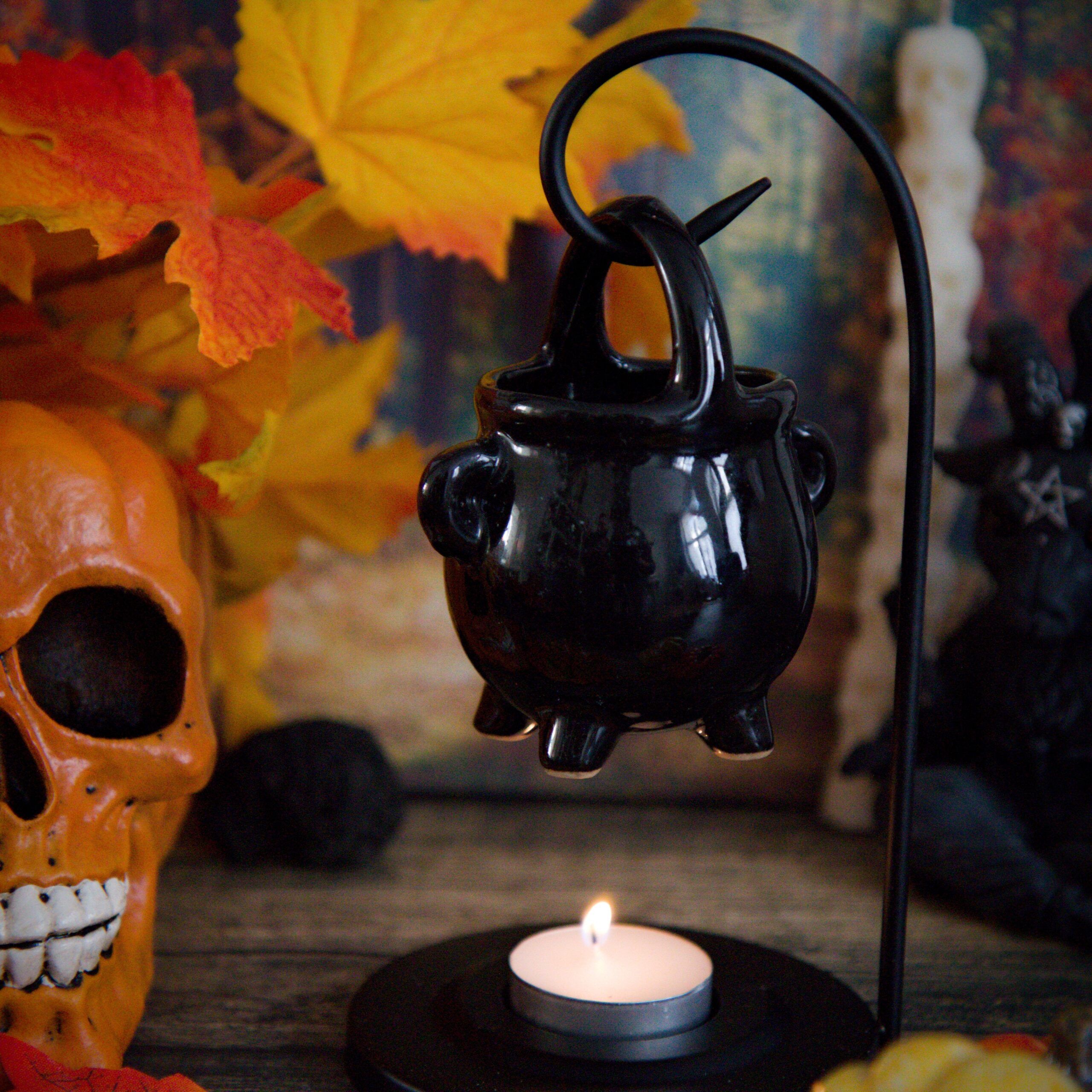 Brûleur pour huiles essentielles et parfums solides en forme de chaudron suspendu.